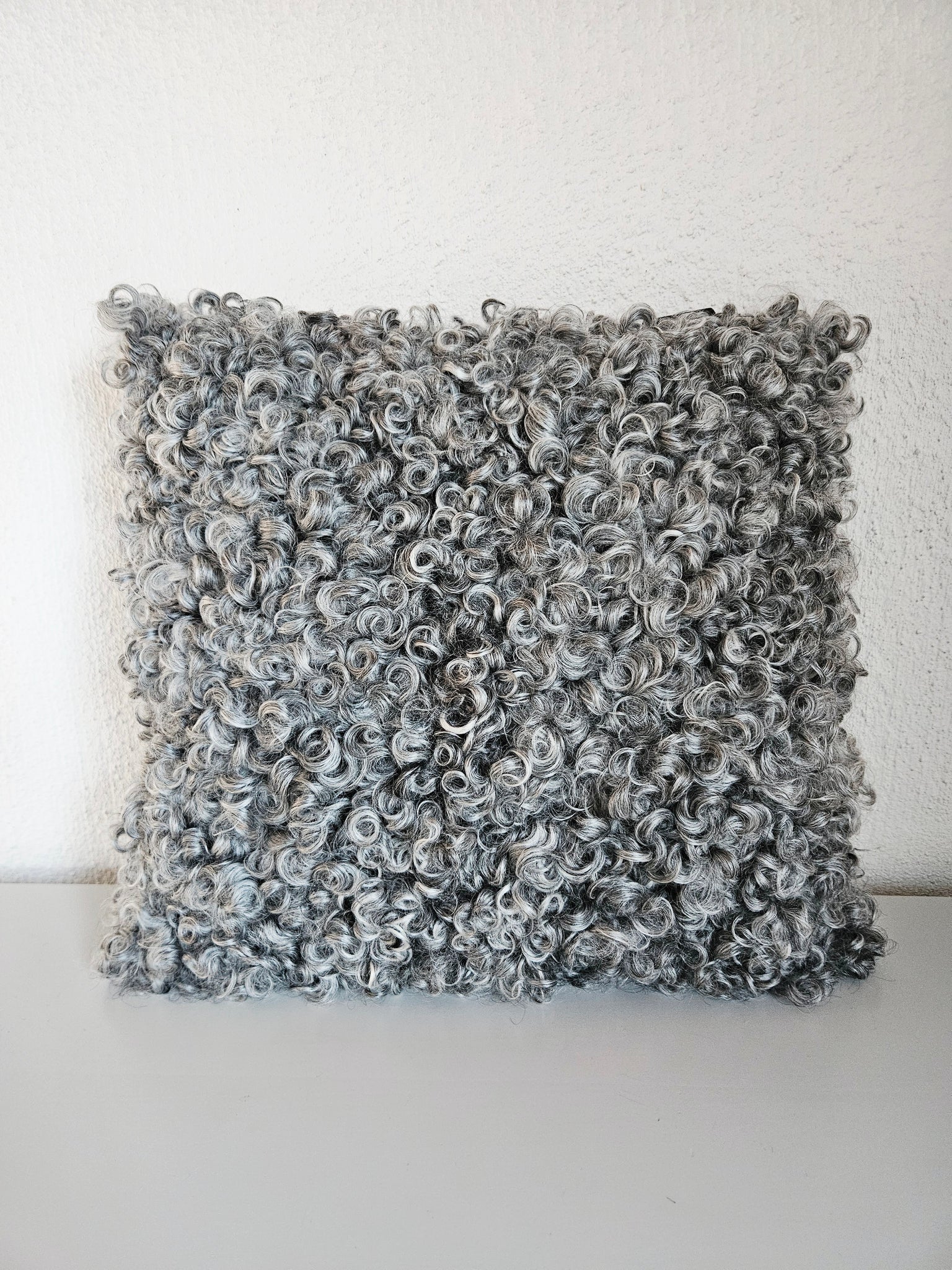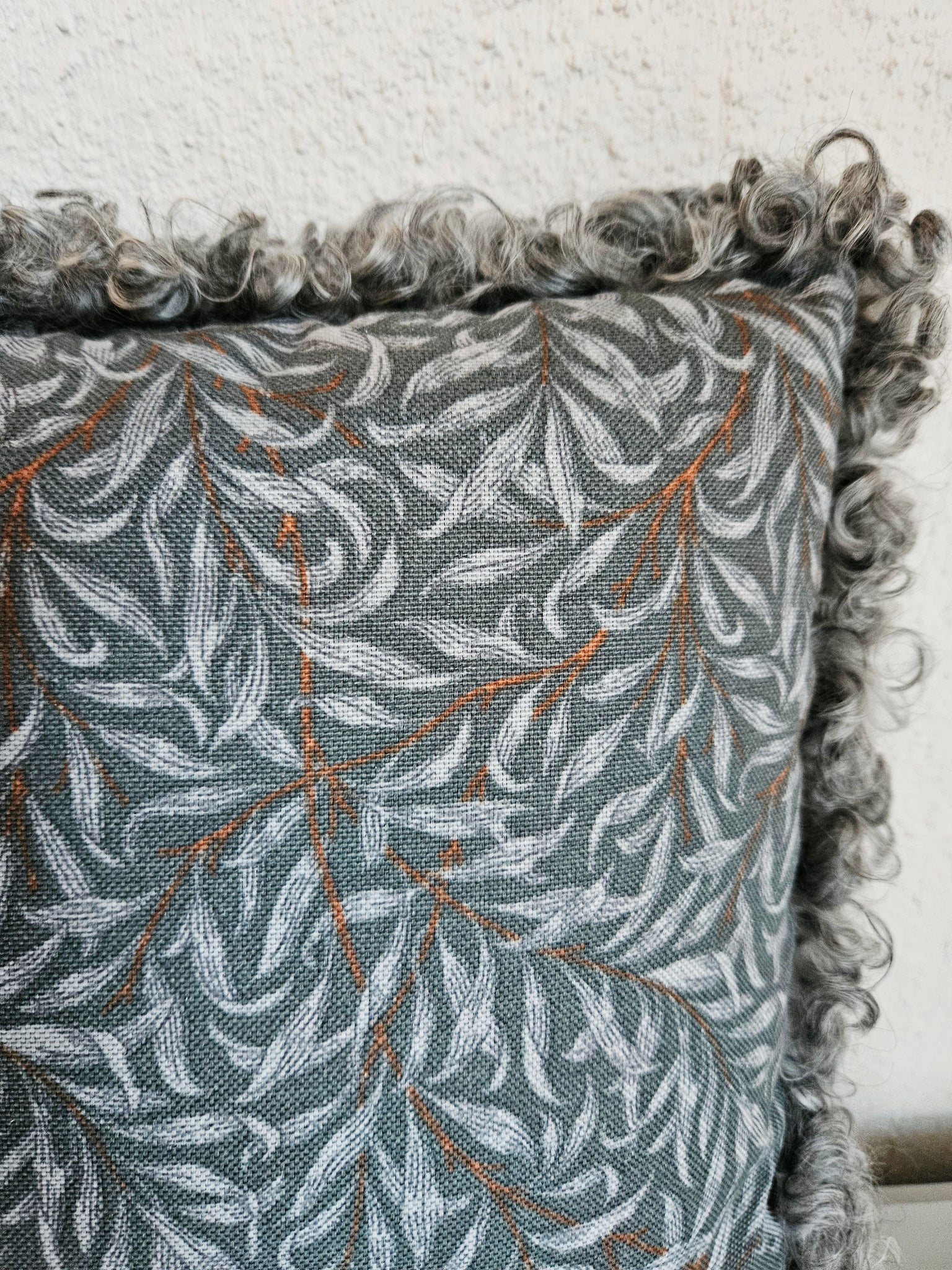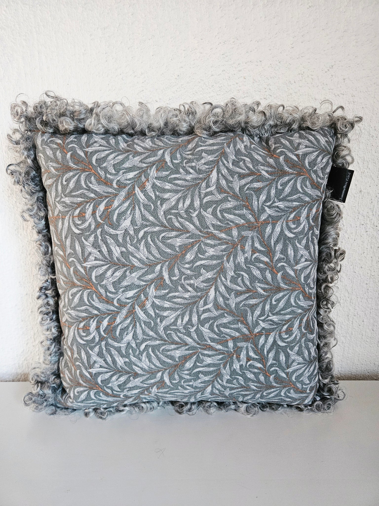 Kudde i mellangrått lammskinn, baksida i mörkgrått tyg med bladmönster ,bomull.
