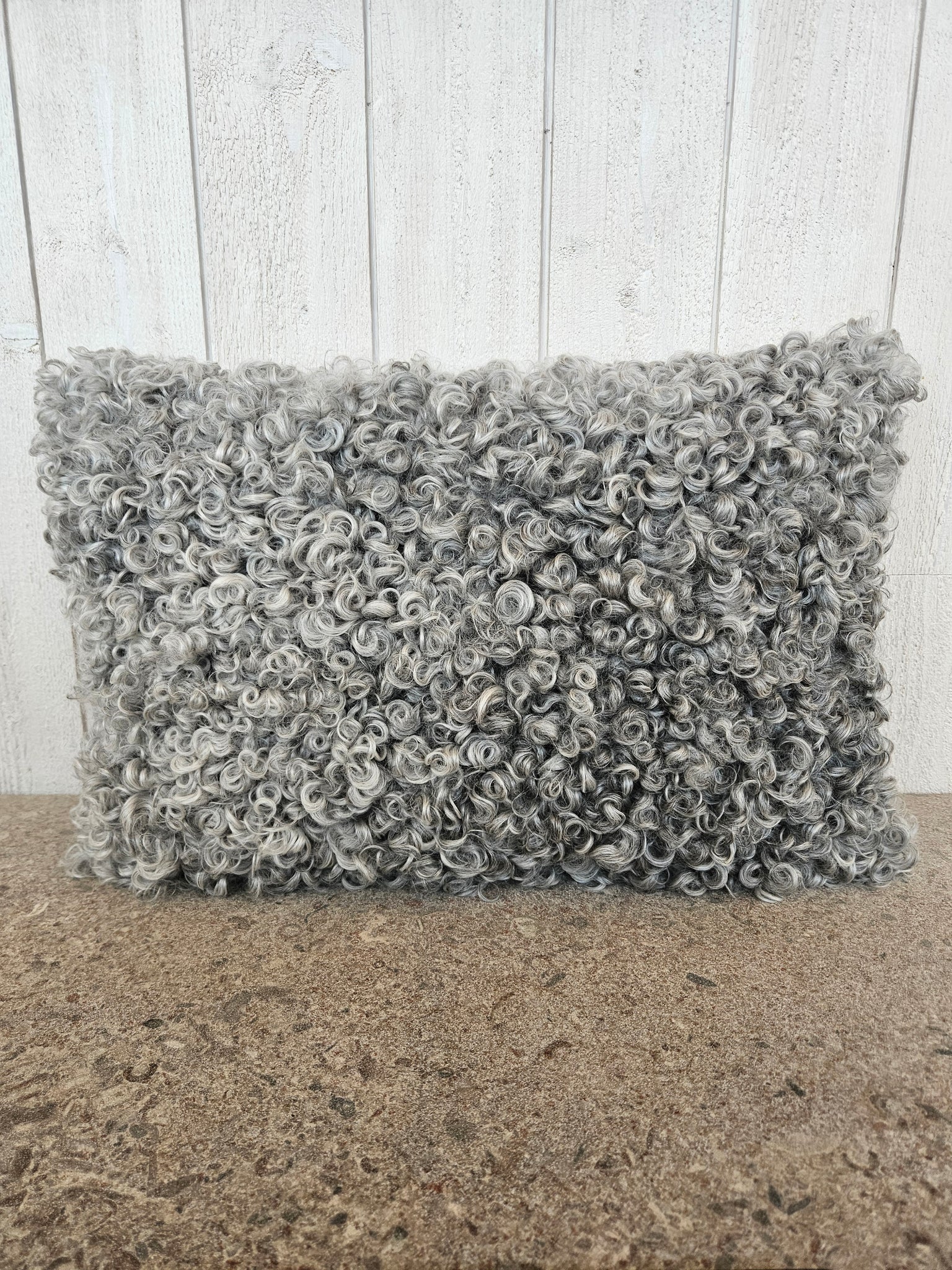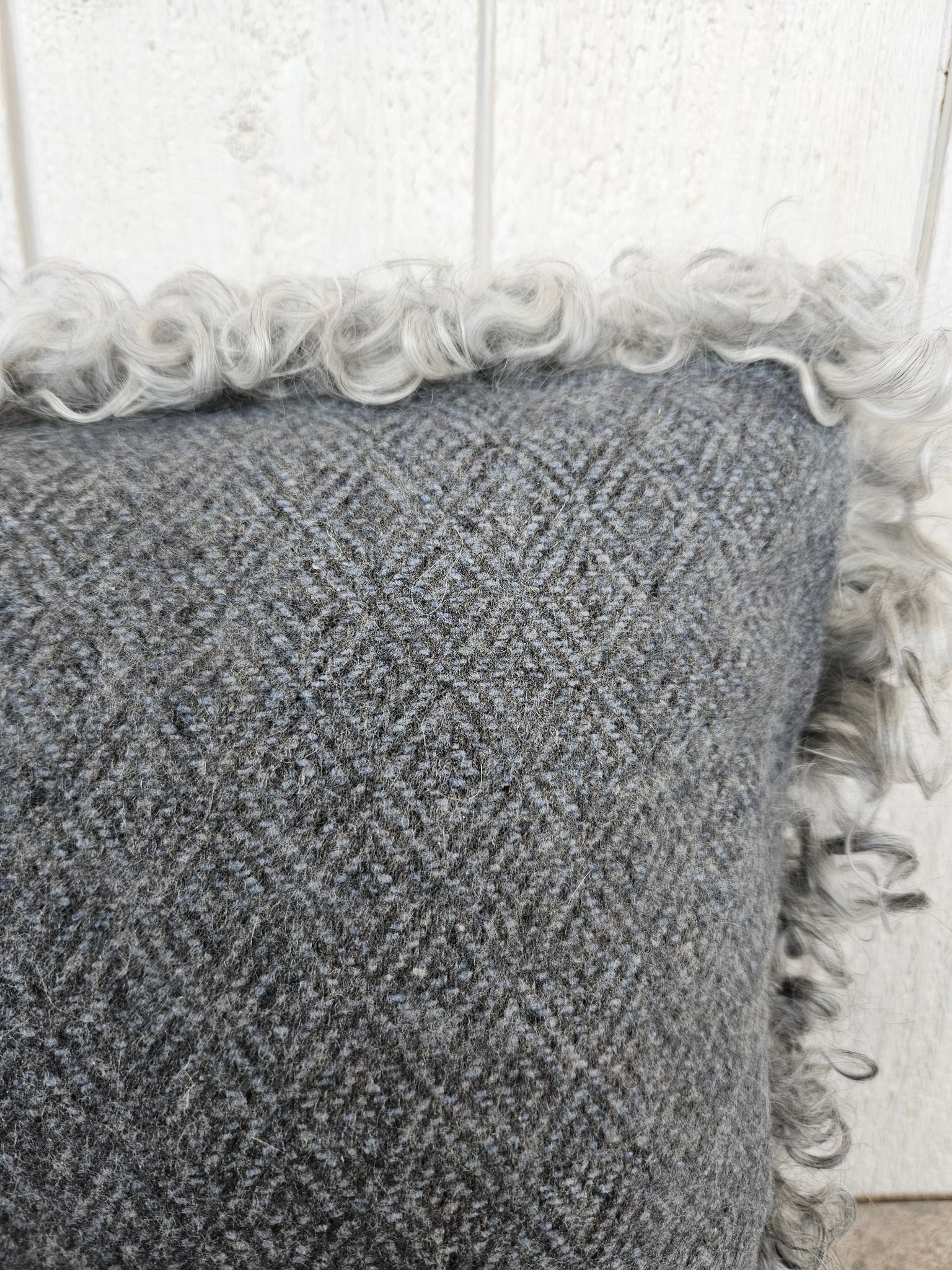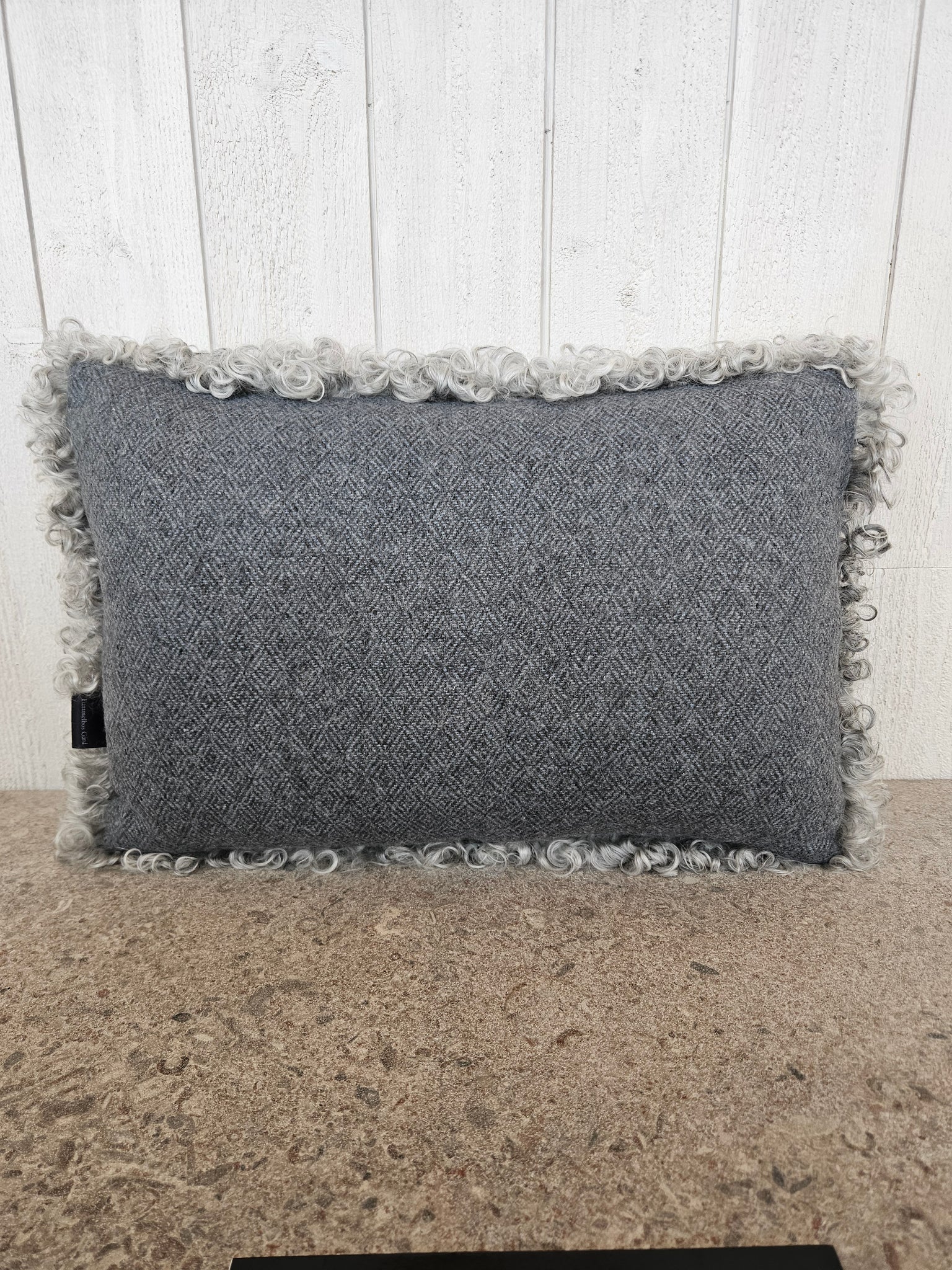 Kudde i ljusgrått lammskinn, baksida i blå-grå diamantkypert ylletyg.