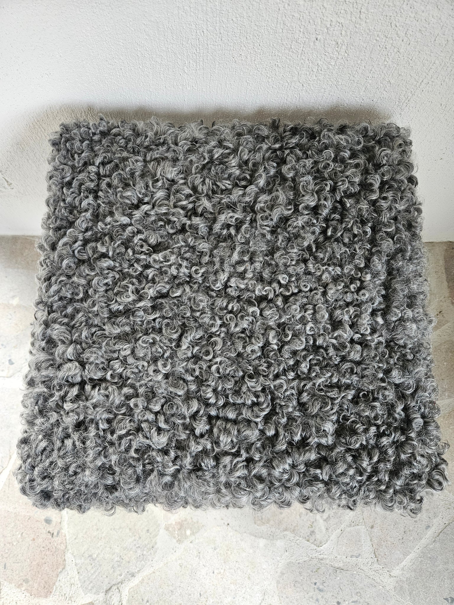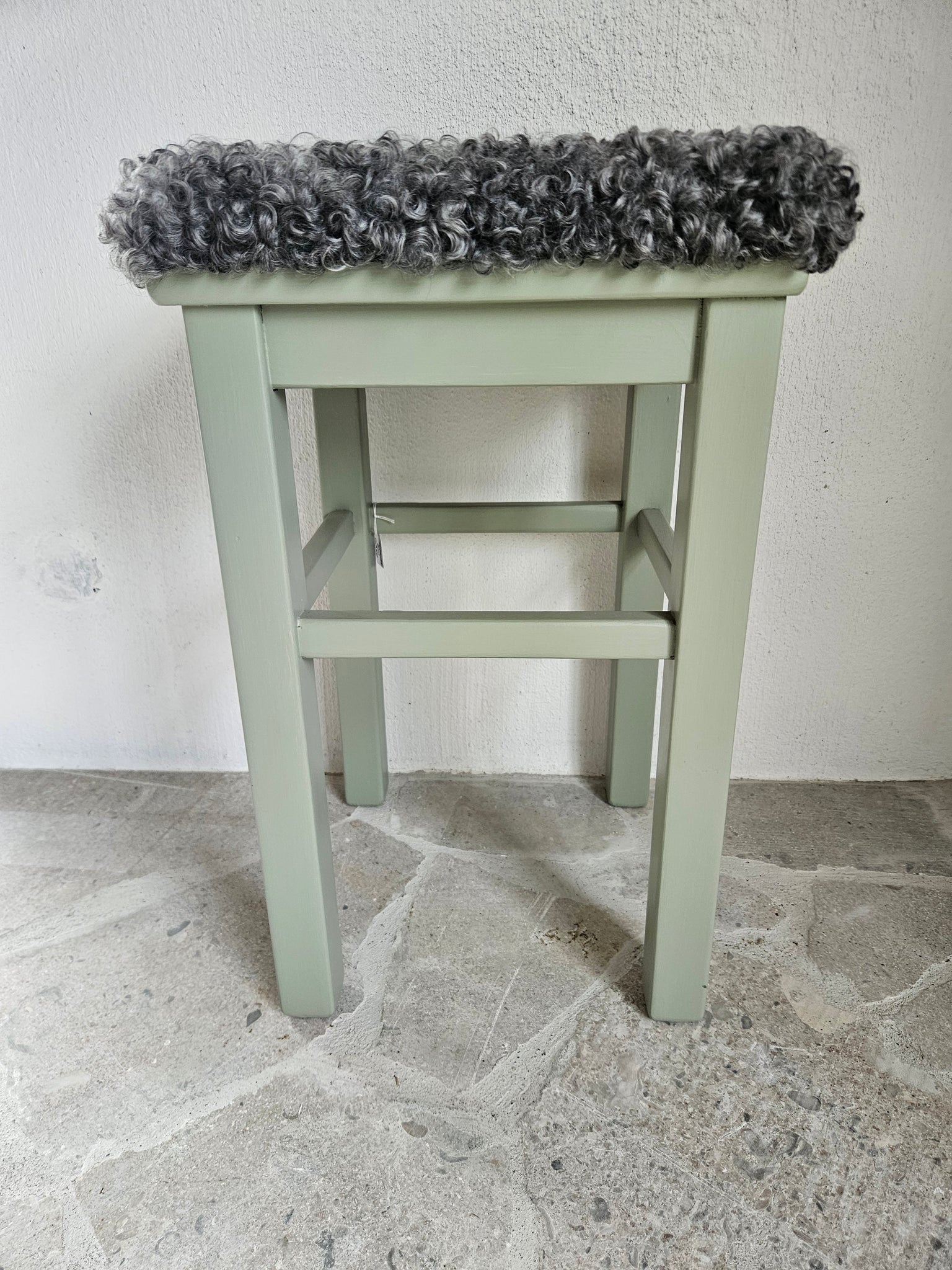 Träpall, målad i en matt grön kulör, med en lös dyna i mellangrått lammskinn.